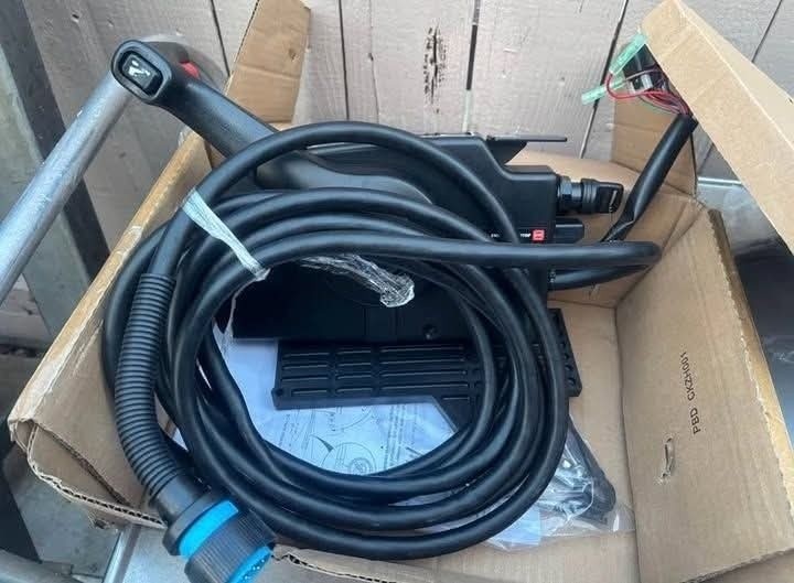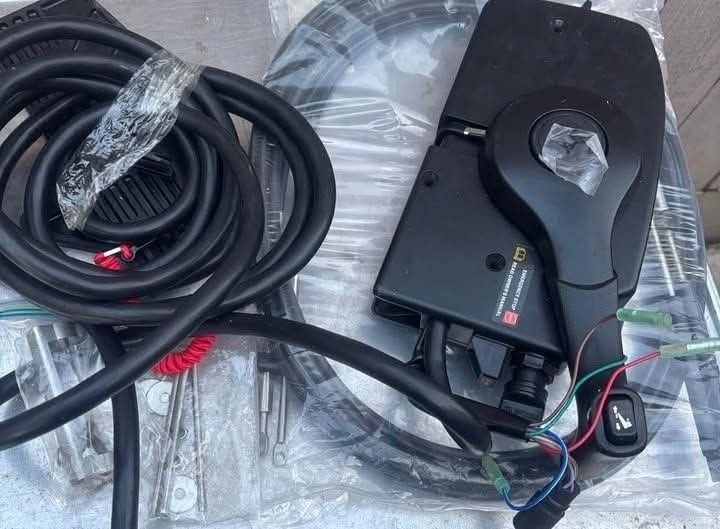 Brand New Mercury Side Mount Control Box with a 14-pin connector. This complete bundle includes throttle cables and all necessary mounting hardware for a professional installation.